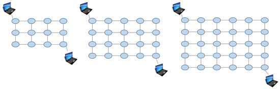 In the first experiment, we verified the effect of the proposed method compared to the Mobile IP-like approach and the previous approach in various sized networks. We prepared three sized grid networks; 3 by 4, 4 by 5, 5 by 6. They are shown in Figure 9. In this experiment, we set the values of in the proposed approach as the default (), no weights put on specific features.