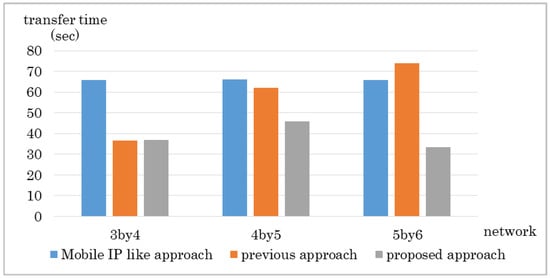 The results are shown in Figure 10 and Figure 11. The proposed method got the shortest transfer time in every network size. The delay for the proposed approach was lower than the Mobile IP-like approach but about the same as the previous approach. The Mobile IP-like approach’s route cannot be the shortest route in this case because the MN moves nearer to the CN however, the route has to go through the home domain. The previous approach considers number of hops first therefore it chooses the route with least hops, which results in the least delay. However, it does not consider bandwidth so if there is any link with small bandwidth in the route it chose, it ends up having a low throughput. The Mobile IP-like approach and the previous approach does not consider bandwidth. Therefore, even if there is a link that has small bandwidth in the route they choose, they cannot avoid the route.