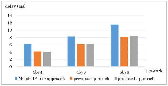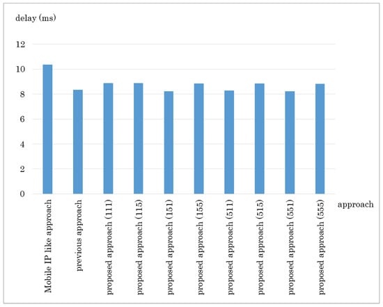 The results are shown in Figure 13 and Figure 14. As we can see from Figure 13, the proposed method improves the Mobile IP-like approach and the previous approach with any combination of weights. The delay seems to differ a bit even so, it was mostly the same when we investigated each trial independently. However, there was a particular network that the delay differed depending on the combination of metrics.