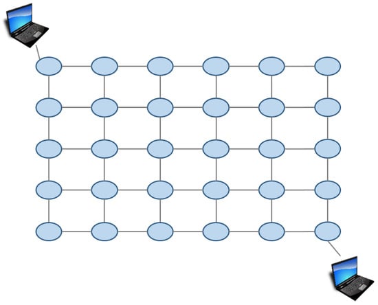 In the second experiment, we changed the three weights and investigated how the changes affect throughput, delay, and processing time. We used the 5by6 grid network shown in Figure 12 in this experiment. The weights is two-valued in this experiment. 5 for higher weight, 1 for lower weight.