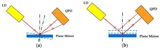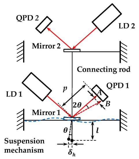 Similarly, when a contact force is applied in vertical, the action on the probe tip will be transferred to the upper elastic mechanism through the connecting rod. The floating plate 1 will only have a translation in vertical since its angular displacement is limited by the centrally symmetrical leaf spring 1; the x signal from QPD 1 will have a new output that is a cross-talk error and can be reduced by the decoupling method in Section 4. The floating plate 2 will have both a translation in vertical and an angular displacement, the signal from QPD 2 corresponding to the signal of QPD1 will also have a new output, which is used as the sensing signal in vertical, the sensing principle is shown in Figure 3. Therefore, the voltage signal corresponding to probe tip’s displacement in z direction can be defined as follows: