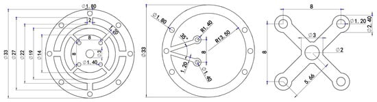 Dimensions of the leaf spring 1 (left), leaf spring 2 (middle) and the floating plate 1 and 2 (right), (unit: mm).