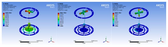 The stiffness of the probe should be isotropic and controlled to less than 1 mN/μm []. To obtain an appropriate stiffness, two patterned leaf springs and floating plates as Figure 1 and Figure 2 shows were designed. Simulation analysis using ANSYS software was performed to design and optimized the elastic mechanisms since it is difficult to calculate the mechanical model of the complex leaf spring. Several parameters of the elastic mechanism affect the stiffness of the probe directly, such as material, diameters, widths, thickness and the length of the stylus. Beryllium bronze was used to fabricate the leaf springs because of its excellent elasticity. According to the specification of the selling stylus, the length of the stylus was determined as 10 mm. The remained parameters were tried, analyzed and optimized repeatedly using ANSYS software until achieving a uniform stiffness of less than 1 mN/μm in 3D. Most of the appropriate parameters of the elastic mechanisms are shown in Figure 4 and the others are listed in Table 1. The simulation results using the optimized parameters are shown in Figure 5. From Figure 5, we can see that the probe tip will have a displacement of 1.16 μm and 1.12 μm in horizontal and vertical respectively when a 1 mN force is applied. The simulation results (Figure 5 shows) indicate that the probe tip has a uniform stiffness of 0.86 mN/μm in lateral directions and a quite consistent stiffness of 0.89 mN/μm in vertical direction. Mode analysis was also conducted by ANSYS software to investigate the dynamic characteristics of the probe, the results are shown in Figure 6. The first order natural frequency of the probe should be high than 60 Hz []. From Figure 6 we can find that the natural frequencies of the probe are 164.5 Hz (first order), 203.9 Hz (second order), 309.7 Hz (third order) respectively, which is high enough for the probe.