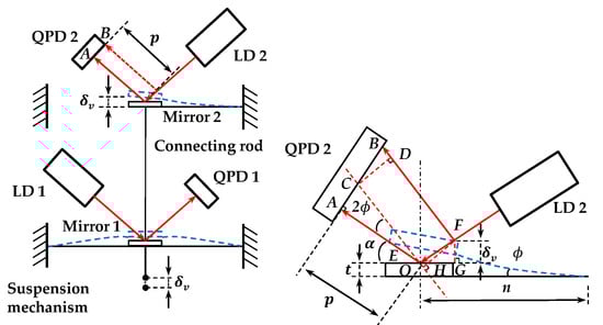 Here, is the angle between incident light and plane mirror. Because all the reflect angles are small in practice and , the displacement and sensitivity can be written as