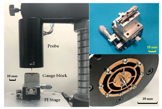 Figure 9 shows the photos of the probe and an experimental setup to investigate the probe’s performance. The probe was assembled in a frame of a stand. A 2 mm × 2 mm square hole formed by four 0 grade gauge blocks was used to contact the probe tip in lateral directions. The thicknesses of the gauge blocks are 2 mm, 2 mm, 1.6 mm and 1.7 mm respectively. The gauge blocks with 2 mm thickness are clamped by the other two. Two parallel surfaces of square hole are the reference planes of the gauge block, but the other two are not. Therefore, the probe tip can be contacted in a lateral direction by the two reference planes of the square hole. The contacting direction can be changed by rotating the shaft of the probe, assisting with a round dial with an accuracy of 0.5 degree. A 2D linear stage was used to change the initial position of the square hole manually. A high-precision 3D nano-positioning stage (Physik Instrument (PI), model P561.3 CD with 2 nm repeatability and 100 μm travel, Karlsruhe, Germany) was used as a displacement reference.