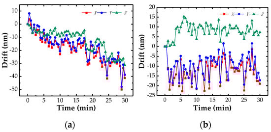Drifts of the probe: (a) the temperature was not controlled; (b) the temperature was controlled.