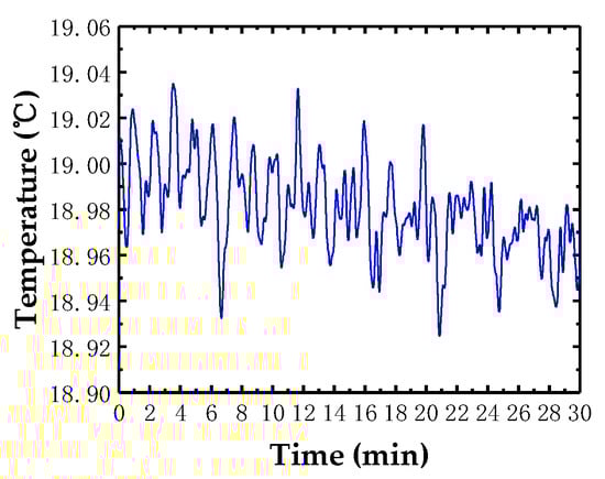 Stability is a key parameter of the probe, which needs to be tested. Considering that most of the components can be measured within half an hour, the drift of the probe was tested about 30 min in this study. Figure 10a depicted the drift of the probe in 30 min when the temperature was not controlled. The drift reaches about 60 nm, which caused by the temperature fluctuation. A similar test was also conducted when the probe was covered by a constant temperature chamber developed by ourselves []. Figure 10b demonstrated the results when the temperature’s fluctuation was controlled within less than 0.13 °C (Figure 11 shows). The drift is approximately 23 nm in 30 min, which can be reduced furthermore if a more stable temperature was achieved.