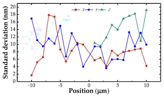 The behavior of single-point probing was also tested through the experimental setup as Figure 9 shows. The probe tip was contacted by the reference planes of the high-accuracy gauge blocks driven by the PI stage along the X+, X−, Y+, Y−, and Z directions respectively. For each touching action, the probe tip was pushed 1 µm, the output signals were recorded and then the gauge blocks were moved back. The procedure was repeated 10 times in each point. Figure 12 exhibited the repeatability measurement results of the probe. The maximum standard deviation is 18.2 nm within the measurement range of µm (X × Y × Z).
