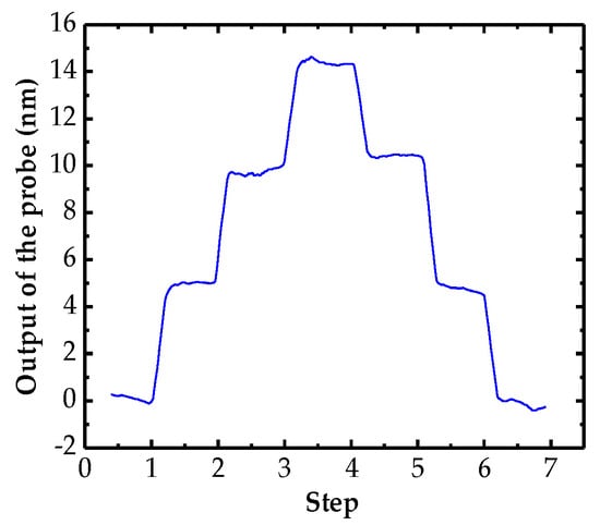 The resolution of the probe in its measurement range is an important parameter that determines the precision of the whole CMM system. An experiment was conducted to further verify the measurement resolution of the probe by using the experimental setup as Figure 9 shows. At the beginning of the experiment, the stage was controlled to drive the gauge block to push the probe tip and then reverted to the initial position. The probe was pushed forward three steps and then retracted. The moving step was set from 10 nm to 5 nm with an interval of 1 nm in sequence and the resolution could be determined by the minimum clear step. Figure 13 illustrates that the resolution of the probing system is better than 5 nm.