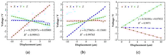 In order to calculate the transfer matrix, a test was conducted in X+, X−, Y+, Y− and Z direction respectively with an interval of 1 μm. The experimental setup as Figure 9 shows and a similar measuring process of repeatability test was also used. In order to minimize the influence of the random errors, 10 tests were repeated in each position and the average values shown in Figure 14 were used. Figure 14 shows that the probe has a basically uniform sensitivity of 0.3 V/μm. The difference could be caused by the manufacturing and assembling errors.