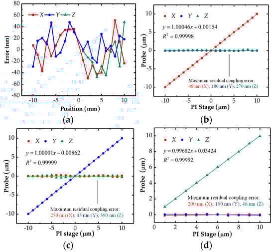 The above calibration experiments were conducted again to verify the effectiveness of the obtained transfer matrix. The probe was tested one time in each position. The errors of the decoupling model in each axis shown in Figure 15a can be obtained by comparing the displacements of the PI stage with the values calculated by the transfer matrix. Figure 15a illustrates that the probe error caused by the decoupling model was less than ±50 nm in each direction. Figure 15b–d presents the decoupled results of the probe when the probe was contacted along X, Y and Z directions respectively. The cross-talk errors have been reduced from several micrometers to 390 nm. The nonlinearity of the line X in Figure 15b, line Y in Figure 15c and line Z in Figure 15d are 0.28%, 0.19% and 0.42% respectively.