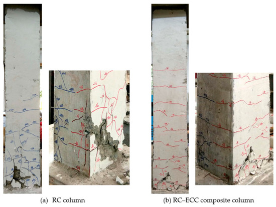 - The failure mode hybrid steel—FRP-reinforced concrete—ECC composite column was different from that of the hybrid steel—FRP-reinforced concrete column. Severe matrix spalling and local buckling of FRP bar were observed in the reinforced concrete column, but did not appear in the composite column. ECC can provide a more stable confinement on the GFRP bars than that of concrete.
