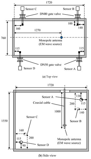 Figure 1 illustrates a schematic diagram of a steel tank of 1350 kVA transformer and positions of four UHF drain valve sensors [,] and a monopole antenna in the first experiment. Inside dimension of the transformer tank was 1720 mm in length, 760 mm in width and 1550 mm in height, respectively. There was a hole with 100 mm in diameter on the top of the tank, through which a monopole antenna was inserted and used as an EM wave source. Note that in this experiment, the transformer tank was not filled with the insulating oil.