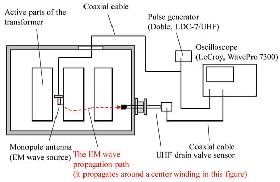 A monopole antenna of 20 mm in length and 1.3 mm in diameter was used as an EM wave source, instead of a typical PD source (e.g., a needle-plane electrode system) since it radiates stable EM waves regarding amplitudes and frequency spectra. The antenna was excited by a voltage pulse generator (Doble Engineering, UHF calibrator LDC-7/UHF, Watertown, MA, USA) through a 50 Ω coaxial cable of approximately 2000 mm length. The output voltage of the pulse generator was set to 60 V.