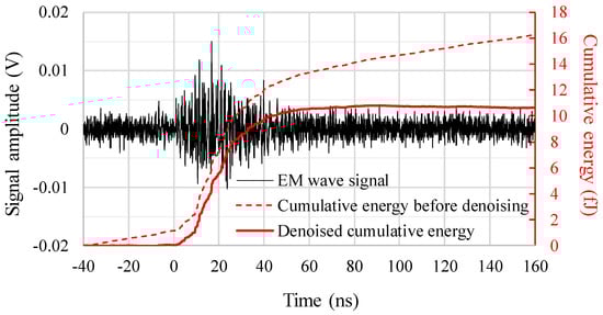 where V(iΔt) is a voltage of the EM signal at t = iΔt. Z and Δt are an impedance of the measurement circuit (usually 50 Ω) and a sampling period, respectively [,]. However, in this experiment, some measured signals showed low SNR (signal to noise ratio) due to the severe attenuation of the EM waves by the deflation and reflection, resulting in calculation errors of the cumulative energies.