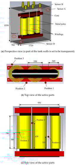 However, the EM waves radiated from PD tend to suffer severe attenuation within the transformer before arriving at UHF sensors. In some cases, this results in low detection sensitivity of the PD signals, especially when the active part of the transformer (e.g., windings, core and leads) disturb the EM wave propagation [,]. Furthermore, localization based on TDOAs also leads to large errors due to the roundabout propagation path of the EM waves. In order to understand the propagation and attenuation characteristics of EM waves within transformers and to evaluate PD detection sensitivity as well as the propagation time quantitatively, a computational approach to simulate the EM wave propagation is essential.