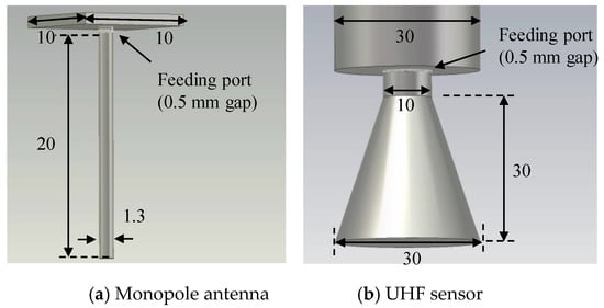 Figure 7 illustrates models of the monopole and UHF antennas with the gap feeding. The monopole in the simulation model was 20 mm in length and 1.3 mm in diameter with a plate conductor having an area of 10 mm × 10 mm. The probe of the UHF sensor was a circular truncated cone shape with a bottom diameter of 30 mm, a top diameter of 10 mm and a height of 30 mm and it had a conductor with a diameter of 30 mm. The gap lengths of the feeding port were set to 0.5 mm for both the monopole and UHF sensors and their impedance was set to 50 Ω. An exciting voltage signal was applied to the feeding port of the monopole antenna and the received voltage waveform across the port of the UHF sensors were analyzed.