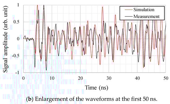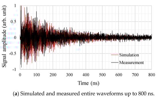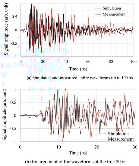 Figure 8 shows an example of the simulated and measured EM waveforms by sensor A. In this figure, the signal amplitudes of both the simulated and measured values were normalized by the maximum signal strength of each waveform. Figure 8a,b show the entire waveforms up to 800 ns and the enlargements of the first 50 ns, respectively. From these figures, it can be seen that the attenuation degrees of the signal amplitudes and the time-domain EM waveforms by the simulation and measurement showed quite good agreement with each other, especially for the first 10 ns in Figure 8b. Such a good agreement of the simulated waveform with the measured one has never been reported before.