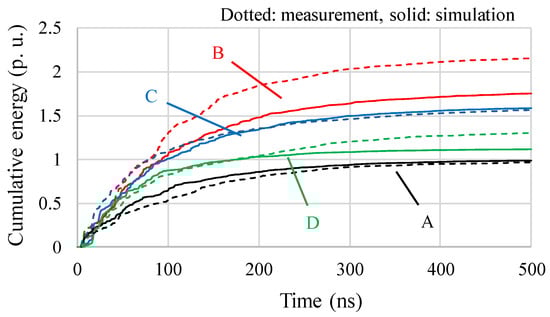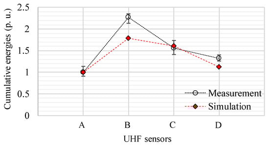 Figure 9 compares the simulated and measured cumulative energies for the four UHF sensors. In this figure, the cumulative energies were normalized by the values by sensor A. Both the simulated and measured results showed a similar trend that the sensors A and B showed the lowest and highest sensitivities, respectively, although the maximum error between the simulated and measured results was about 21% for sensor B. Figure 10 shows cumulative energies as a function of time for the four UHF sensors. Although convergence values of the cumulative energies by the simulation and measurement showed some differences, especially for sensor B as expected from Figure 9, the degree of increase in the cumulative energies in the simulation showed reasonable agreement with the measured ones.