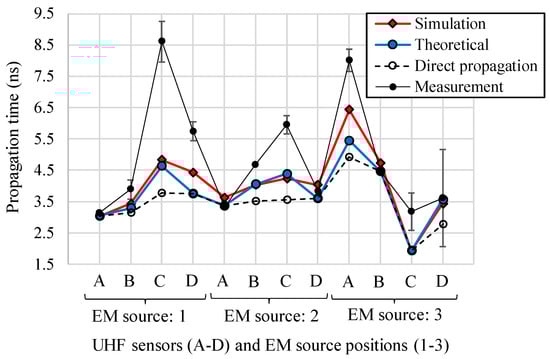 Figure 12 shows propagation times of the EM waves, obtained by the simulation, the experiment and theoretical calculation described above as functions of positions of the UHF sensors and the EM wave sources. For comparison, direct propagation times were also plotted, which were calculated based on the Euclidian distance between an EM source and a UHF sensor divided by the light speed. It can be seen that the simulated and theoretically calculated propagation times showed quite good agreement for all UHF sensors and the source positions, while in some cases, there are some differences of about 1 ns between the simulated results and those calculated assuming direct propagation. This fact indicates that the influences of the active part on the propagation times were accurately simulated and thus the modeling of the transformer active part, mainly the positions and size of the windings, was successfully validated.