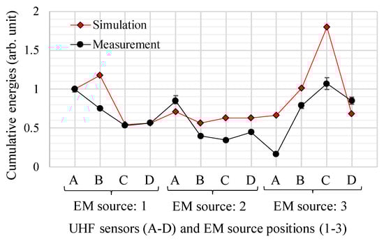 Simulated and measured cumulative energies for each UHF sensors and EM wave source.