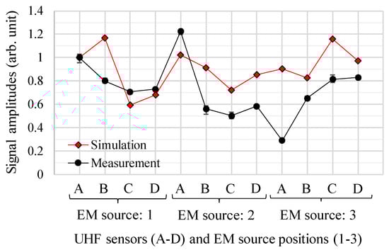 Simulated and measured signal amplitudes for each UHF sensors and EM wave source.