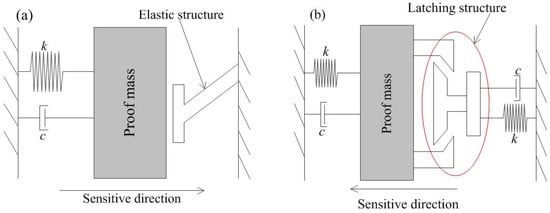 To achieve stable and low frequency trigger signals, two inertial switch structure design schemes are proposed. The first is a flexible contact scheme based on a non-silicon MEMS process from bottom to top [8,9,10], the other is a latching structure based on silicon etching [11,12]. The operating principles of above two designs are shown in Figure 1. The former design requires high stability of the device during the contact process, and the research results indicate that the low frequency and stable trigger signal can be obtained when the threshold acceleration is less than 100 g. However, the contact process is influenced by many factors such as frequency of impact load, threshold acceleration, and so on. Especially as the threshold increases, the trigger signal of the inertial switch with flexible electrode also becomes unstable and the contact time is short. For the latching structure design scheme, a latching acceleration switch with a threshold of more than 4000 g was proposed by Guo et al. The movable electrode latched into stationary electrode when the acceleration exceeded the set threshold, and the trigger signal was a step wave. The main fault of latching model, is that it was a disposable product, unsuitable for repeated use.