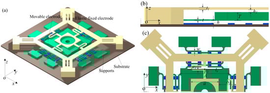 In order to prolong the contact time between electrodes and improve the contact stability, a new type of spring stationary electrode is presented in this paper. The whole structure of the device consists of three parts: many strips are symmetrically distributed on the substrate, which can weaken the effect of air damping in the z direction [15]. The proof mass is suspended by four groups of conjoined serpentine springs to operate as the movable electrode. The cross springs keep the stationary electrode suspended above the proof mass. In this model, the suspended stationary electrode is proposed based on the vibration transmission mechanism. The whole designed structure is shown in Figure 2a. A side view and top view of half the structure are shown in Figure 2b,c.