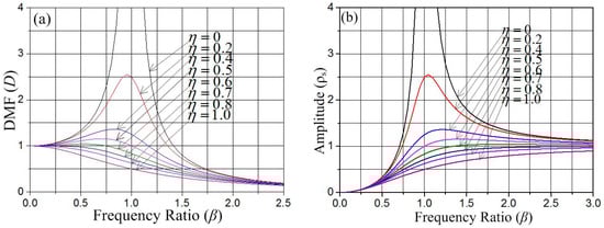 From Equation (7), we have the response displacement on frequency ratio (β), and the dependence of on is shown by the curves in Figure 5b.