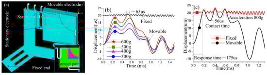 (a) The one quarter finite element model of designed inertial micro-switch. (b) The dynamic response curves of proof-mass and contact point under different acceleration loads. (c) The dynamic response curves of proof-mass and stationary electrode spring under an overload acceleration of 800 g.
