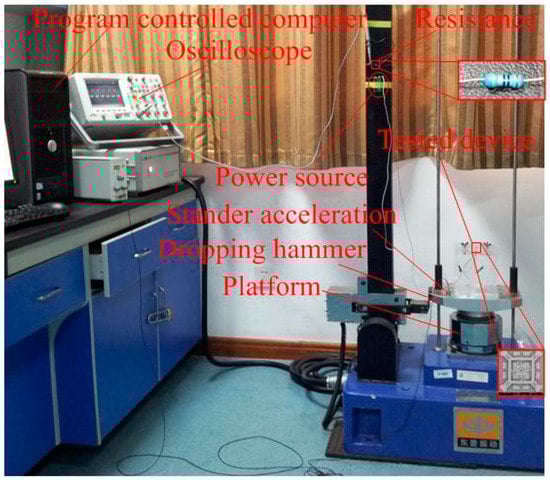 The fabricated prototype was tested by a dropping hammer system, as shown in Figure 11. In addition to the dropping hammer and computer, the main equipment of the testing system includes a standard accelerometer with a sensitivity of 9.8 mv∙g−1, a multichannel oscilloscope (6000 MSO6034A, Agilent, Penang, Malaysia), a DC power source and a 300 Ω current-limiting resistor. The prototype and accelerometer were stationary on the drop hammer. The sensitive direction of the fabricated prototype was installed perpendicularly to the ground. The pulse width of the applied acceleration was controlled by the stiffness of the pedestal. The acceleration applied to the testing prototype increased as the height of the dropping hammer rose from low to high, so the threshold of the designed inertial switch would be measured. The output acceleration curve is shown in the display and the corresponding signal is captured by the oscilloscope when the inertial switch is switched on.