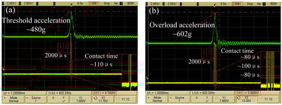 The threshold acceleration of the designed inertial micro-switch is 480 g with a pulse width of about 1 ms, as shown in Figure 12a. The contact time is about 110 μs, which indicates that the contact time of the designed inertial switch can be prolonged owing to the proposed stationary electrode. An overload acceleration had been applied to the prototype. The test result is shown in Figure 12b, which indicates that the the overload acceleration is about 602 g with a pulse width of about 1 ms. The contact time indicated that three contacts occurred, and the maximum contact time is about 100 μs. Through shocking experiments by applying an overload acceleration, the test results indicate that the dynamic contact process is consistent with the simulation result, which proved that the contact process of the proposed stationary electrode is stable. The dynamic process of the test results is in agreement with the simulation results, but the test results of the threshold acceleration and contact time disagree with the simulation results. The simulation and experimental results are compared in Table 2.