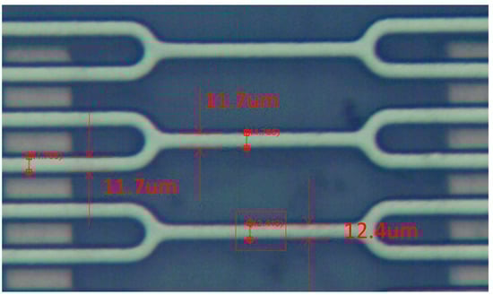 Preliminary analysis suggests that the test contact time is longer than in the simulation because of the effects of friction during the contact process. In addition, the reason why the test threshold is lower than the simulation is that the line width of the suspended spring is less than the design value. The measurement of the line width is shown in Figure 13. The result indicates that the actual value is about 12 μm while the design value is 15 μm, this is the main reason for the error compared with the simulation threshold.