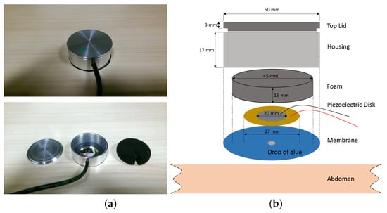 A low-cost and straightforward piezoelectric sensing head that connects to a sound recorder (e.g., a personal computer) was used for BS recordings. This piezoelectric sensing head consisted of a solid housing, a membrane, a piece of foam and a piezoelectric disk. The piezoelectric disk is composed of a PZT ceramic circle on the top of brass circular base, with diameters of 20 mm and 27 mm, respectively. The thickness of the disk is 0.52 mm and the resonant frequency and impedance are 4200 Hz and 300 Ω, respectively. This piezoelectric disk is commercially available, and the reader could buy it online. The sensor head configuration is shown in Figure 1 with dimensions. Due to the stimuli mechanism of piezoelectric sensors, which are triggered by vibration, the housing can effectively block out the ambient noise. In addition, the housing was made from aluminum material, which effectively suspends friction noise from the belt and clothes due to its smoothness. A piece of foam was inserted inside underneath the top lid to push down the piezoelectric sensor and membrane therefore establishing a better contact with the abdomen. The piezoelectric sensor was attached to a membrane at the center with a dot of glue. Subsequently, the BS related vibrations of the abdomen can be transferred to the piezoelectric disc effectively. The sensor was compared to that of a state-of-the-art electronic stethoscope (Litmann 3200) when listening to BS and showed a similar performance. A stretchy tubi-grip belt was used to hold the sensor head at the right location. This low-cost and straightforward piezoelectric sensing device can effectively detect the BS with high accuracy compared to sensors used in previous research. Multiple bio-indexes can be observed such as sound index, sound duration, and the MMC.
