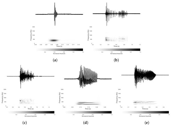 An example of the (a) single burst; (b) multiple bursts; (c) random continued sound; (d) harmonic sound; and (e) combination sound in time domain (top) and its corresponding spectrogram (bottom).
