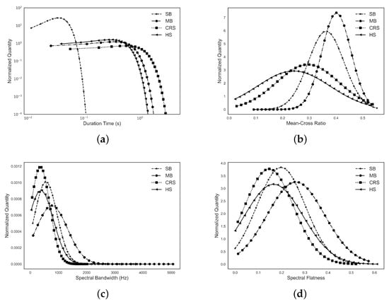 Normalized distribution (area under curve equals to one) of acoustics characteristics of four types of BS including (a) duration; (b) mean-cross ratio; (c) spectral bandwidth; and (d) spectral flatness.