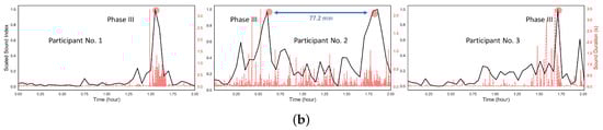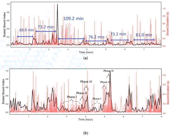 In addition, the MMC pattern was also observed in the other ten participants from their two-hour recording based on the sound index. As shown in Figure 5b, the peaks of Phase III were presented from the sound index of the first three participants and the same observation of the sound duration was obtained. Also, two Phase III peaks with 77.2 min interval time were observed in Participant No. 2. The preliminary tests further demonstrate the utility of our simple, non-invasive acoustic sensing device.