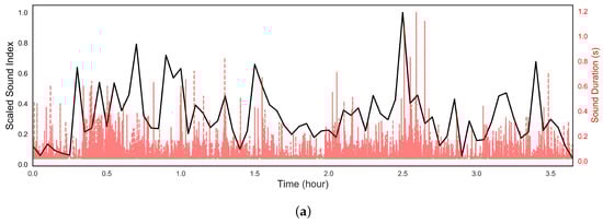 The BS sound index was calculated in a long recording after verifying the performance of our acoustic sensing device and identifying the BS. The presented sound index values are scaled by the maximum values in Figure 4 and Figure 5 for clarification. Figure 4 and Figure 5a shows the scaled sound index over a long-term BS recording from participant L. BS were detected automatically during these eight- and four-hour recordings and the sound index calculated for each three minutes of recording. Also, each BS duration was measured and shown in Figure 4 as the red dashed line. From Table 2, it is clear that SB is significantly smaller than the other sounds so that the duration can be used effectively to separate the SB and others. To see the difference between different parts of the abdomen, the sensor was placed at both the lower and upper abdomen, shown in Figure 4a,b, respectively.