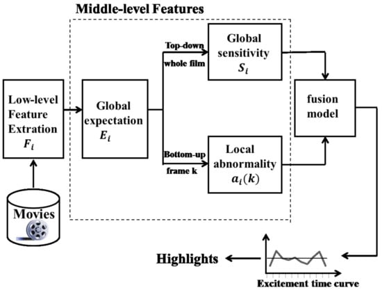Based on the description above, a prototype-based feature is proposed to measure how a specific event is different from its normal level. With this feature, the proposed approach can find out not only events with obvious high feature values, as done in Reference [31], but also segment with highly abnormal feature values. As the extraction of the excitement level in a video is relative to cognitive psychology, existing models need to be psychologically justifiable. Our work is inspired by the following three main principles: