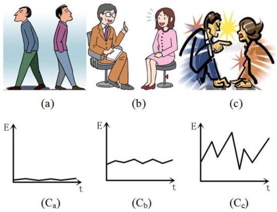 Different situations of people communicating and their probable sound feature curves, which include unconcerned behavior (a), normal talking (b), and quarreling (c).