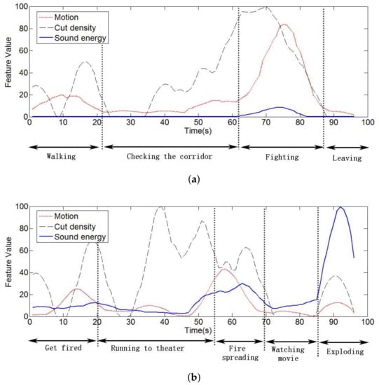 To test the relation between the low-level features and specific events, we extracted the features’ time curves from two segments of famous films, and each curve was filtered by a Kaiser window for the smooth effects, as shown in Figure 3.