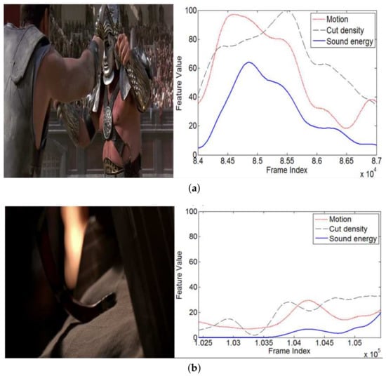 Here, the global expectation is regarded as the prototype of feature i. The absolute value of a difference value is used here, because we consider that the deviation degree of the audio-video effects accounts for the rising emotion level of the user. This is different from References [19,31], where the excitement level was always in a direct proportion to the feature values. For example, in an action movie, a hero may defeat his enemy by a violent attack. On the contrary, he may assassinate an enemy quietly and slowly. Both of the events will evoke the audience’s excitement emotion. However, two cases show completely different audio-visual feature values. Figure 4 shows examples of these situations. The picture is captured from the film “Gladiator”.