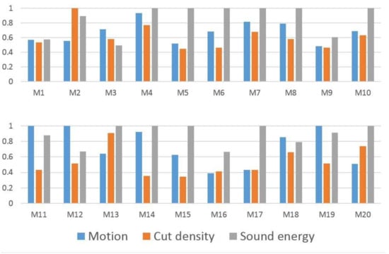 To date, many specific audio-visual features have been proposed to map videos to emotional dimensions of the audience. The most popular cues are motion intensity, cut density, and sound energy [19]. Although these three features reflect various patterns of many film grammars employed by directors to emphasize their work emotionally, new features are desirable to obtain more sophisticated results. In recent work, the facial expression of actors in a film was used to determine the emotional categories [40]. Other useful low-level features include color energy, lighting key, etc. [32,41,42], and deep learning methods [43,44,45,46]. However, these audio-visual features are still insufficient to deal with various patterns in a film, and their stabilities and universalities have not been thoroughly validated. Although only three basic features are used in this paper, the main contribution is that we probe new middle-level features in the field of cognitive psychology instead of testing new low-level audio-visual features. Nevertheless, exploring new features for the proposed framework is still an open option for future investigation.