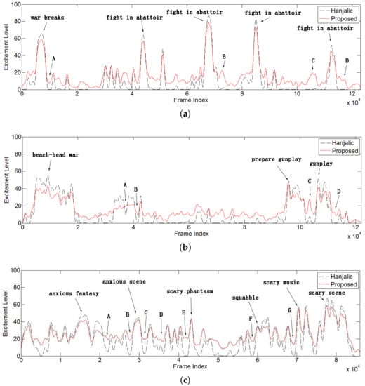 Actually, all these events can provoke various kinds of excitement. The difference above indicated that the proposed combined cognitive psychology model outperformed [19] in extracting these events even with insignificant audio-visual effects. Additionally, sudden slow motion and unusual silent effects are adopted by movie directors to reflect by contrast the excitement level of certain events. In these cases, our proposed approach performed particularly better at generating consistent and continuous excitement curves. Examples can be found for the sampled event points in Figure 8, including Event A for “Gladiator”, Events A–C for “Saving Private Ryan” and Event C for “The Shining”. In contrast, Hanjalic’s approach [19] had a near-zero response for these events.