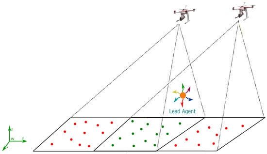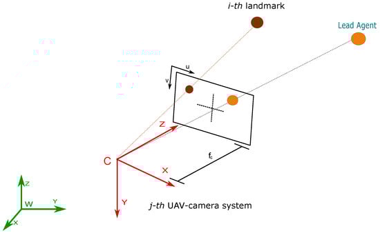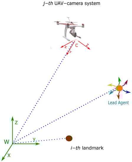 Additionally, let represent the position (in meters) of the lead agent, with respect to the reference system W. Let represent the position (in meters) of the reference system C of the j-th camera, with respect to the reference system W. Let represent the linear velocity (in ) of the lead agent. Let represent the linear velocity (in ) of the j-th camera. Finally, let be the position of the i-th landmark (in meters) with respect to the reference system W, defined by its Euclidean parameterization. In (1), each UAV-camera, as well as the lead agent, is assumed to move freely in the three-dimensional space. Let note that a non-acceleration model is assumed for the UAV-camera systems and the lead agent. Also note that the landmarks are assumed to remain static.