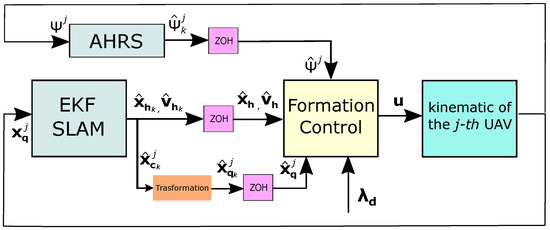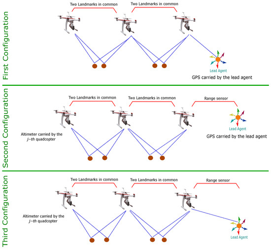 - In the case of the second and third configurations, only a single altimeter sensor, used for measuring the altitude of the j-th quadcopter, is needed in order to obtain the previous results (see Figure 4).