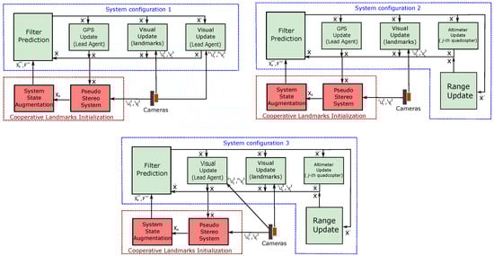 The main goal of the proposed method is to estimate the system state using the EKF-based SLAM methodology. Figure 5 shows the architecture of the proposed system under its three configurations.