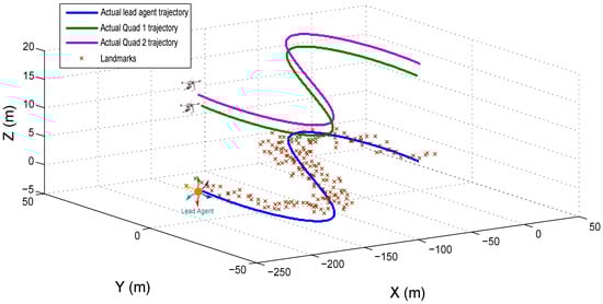Trajectories followed by the lead agent, the Quad 1 and the Quad 2 with the system in closed-loop.