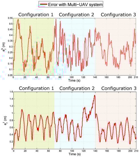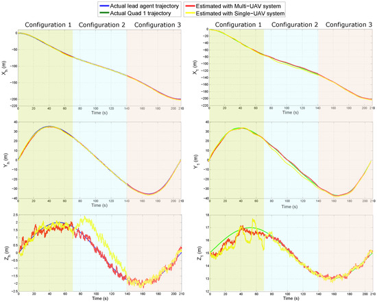 Figure 15 shows, for each configuration, the evolution of the error over the time for the estimated position of the Quad 1 as well as the lead agent, when these estimates are used as feedback to the control laws.