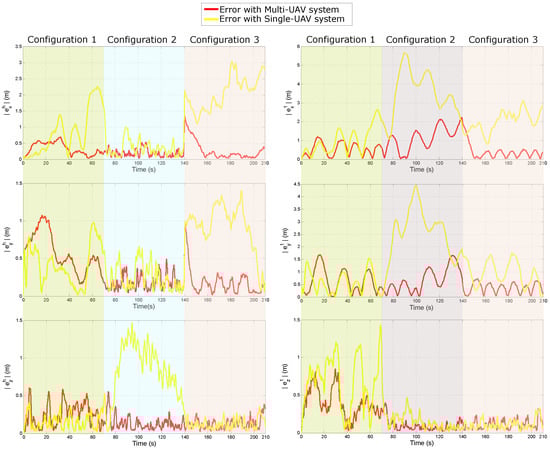 Comparison of the quality of the estimated trajectory obtained with the Multi-UAV system respect to the trajectory obtained with the Single-UAV system. Left column of plots illustrates the errors obtained for the lead agent. Right column of plots illustrates the errors obtained for the Quad 1.
